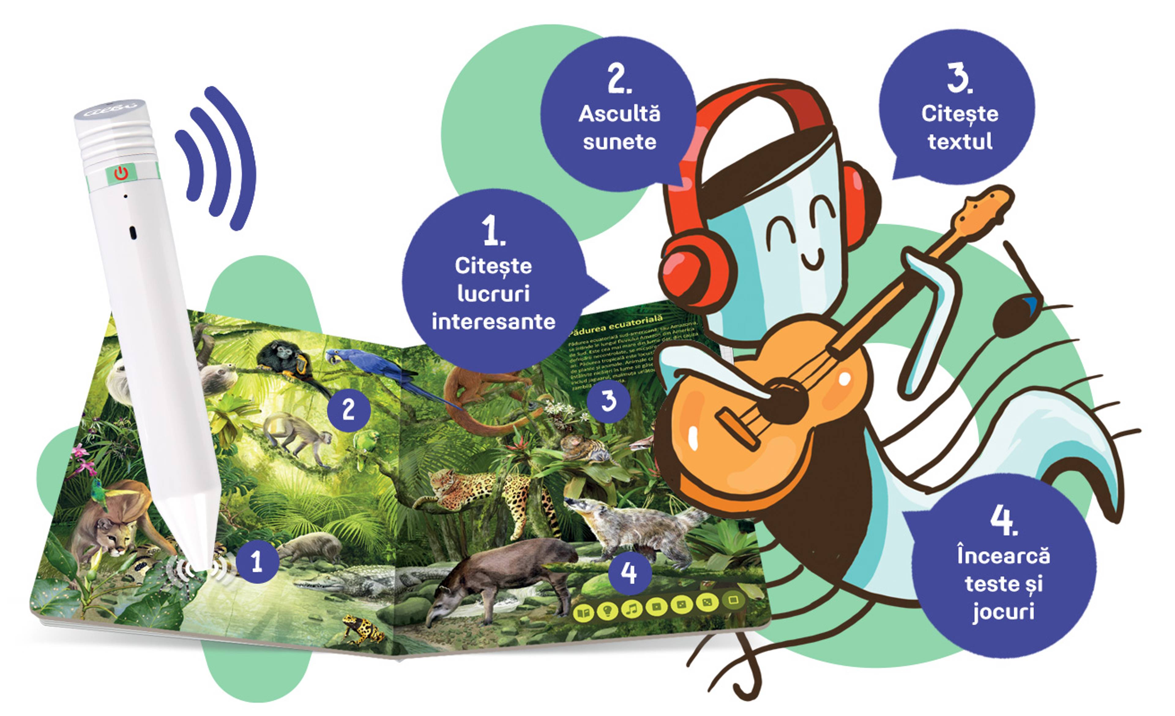 Este foarte simplu. Creionul electronic Albi funcționează ca un cititor de cod special, ce este ascuns chiar în paginile cărților. Atingeți ușor o imagine sau un text utilizând creionul și veți auzi informațiile, sunetul sau muzica corespunzătoare.